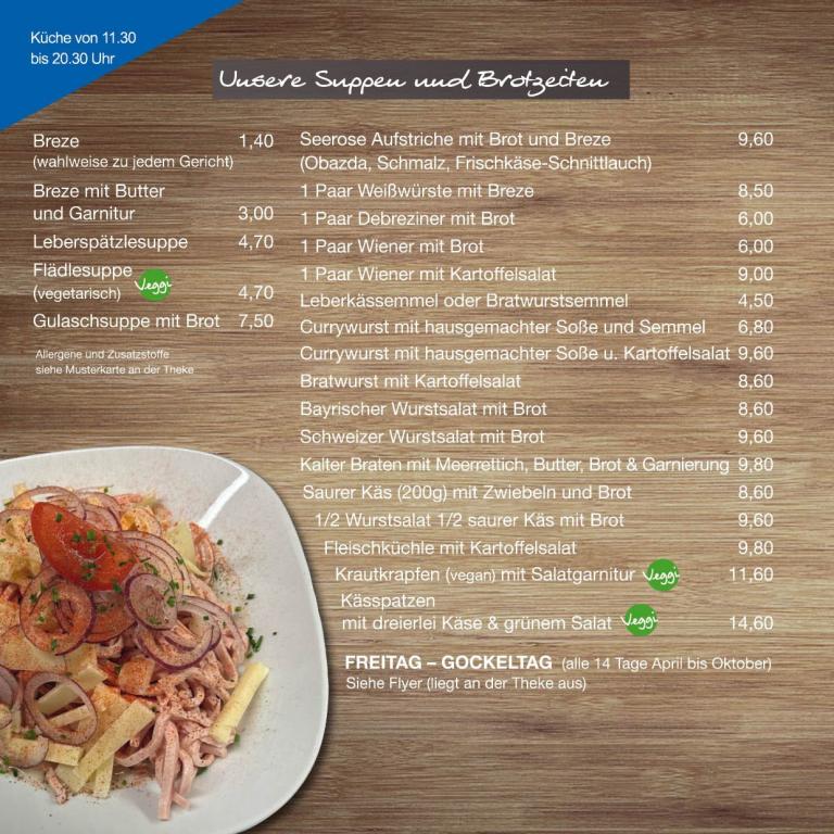 Wir servieren Euch zum Beispiel ein Weißwurstfrühstück, Brotzeitplatten, Krustenbraten, Schweinshaxen und vieles mehr.